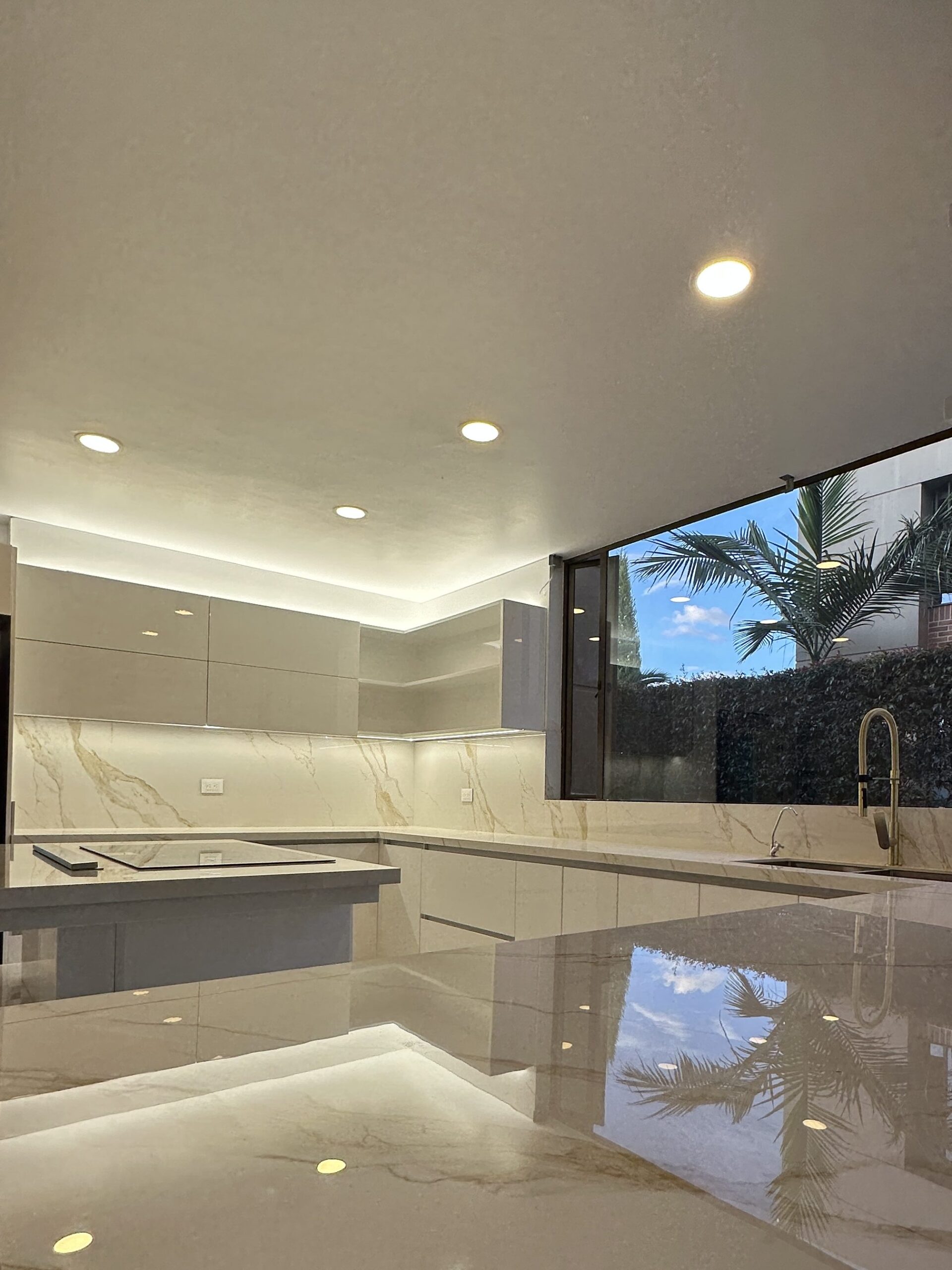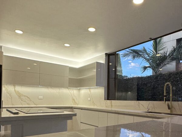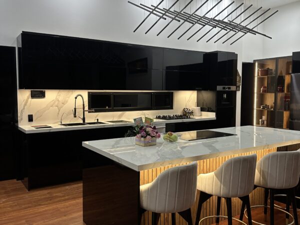 Cocina con puertas terminadas en pintura poliuretano ILVA, mesón en piedra sinterizada Italiana.